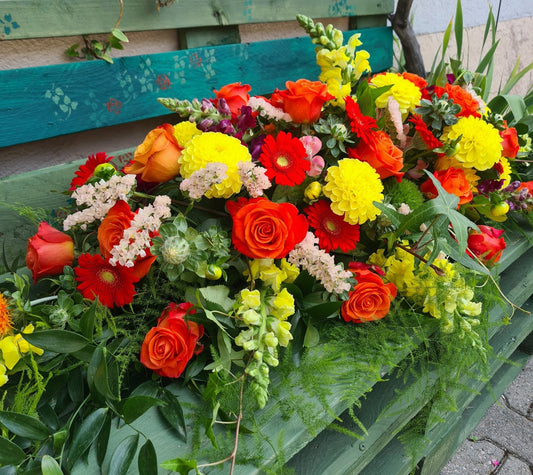 Une collection de fleurs et de produits pour commémorer la perte d'un être cher.