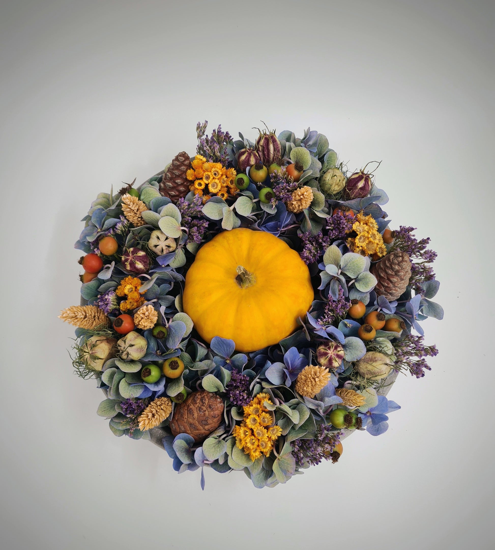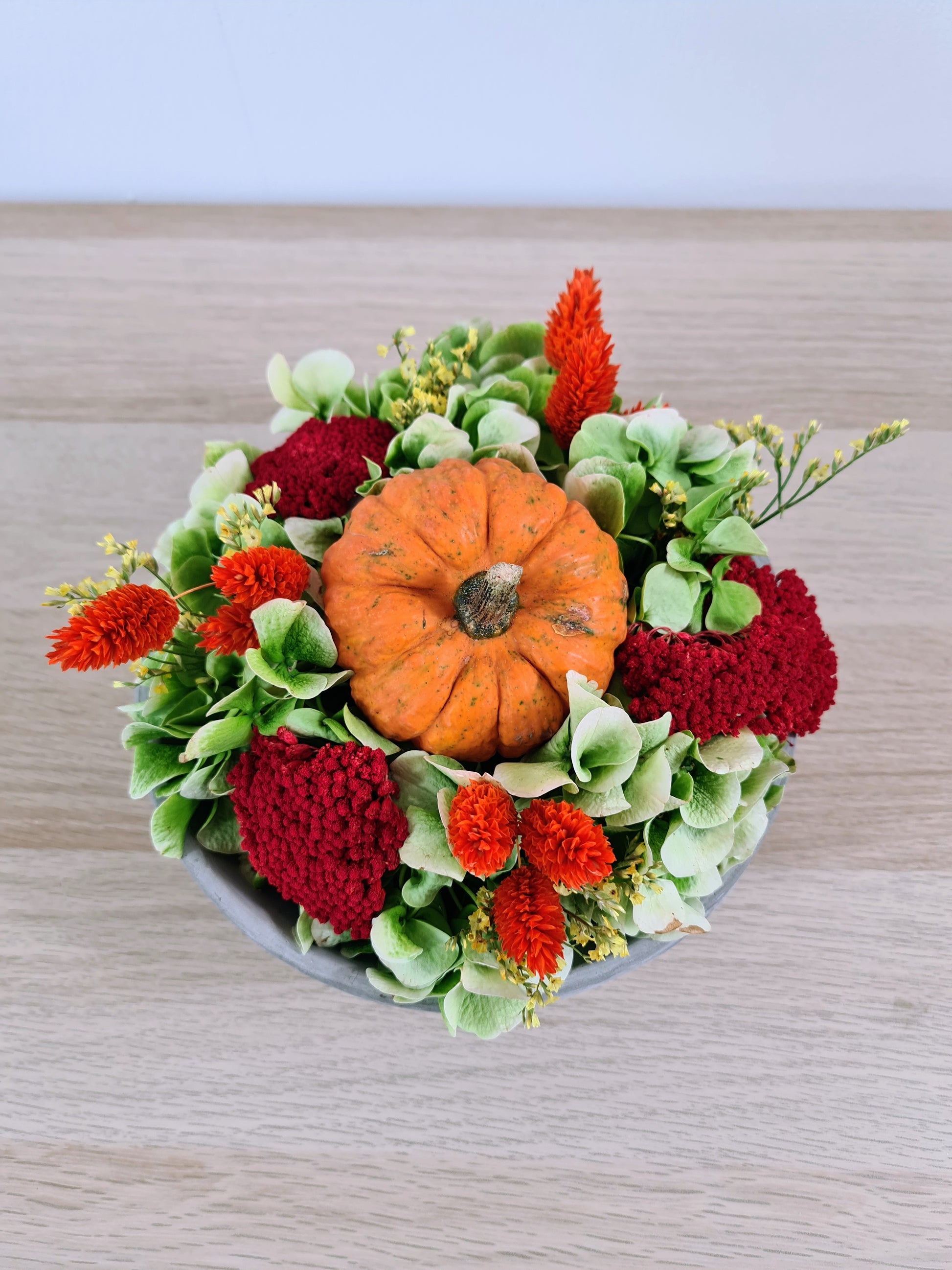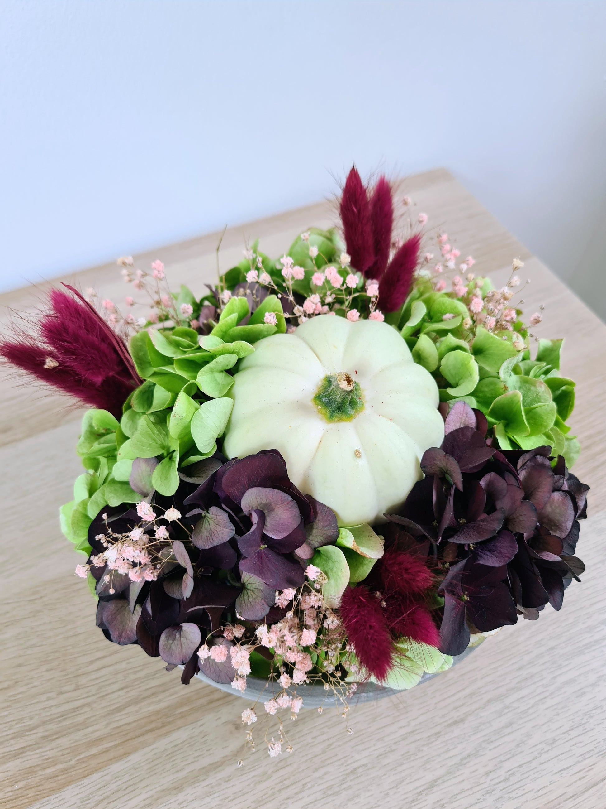 Discover our magnificent autumn arrangement, a round piece that will brighten up your home while celebrating the colors of fall. Made with hydrangeas, this creation can be dried, allowing it to retain its shape and luster for a long time.